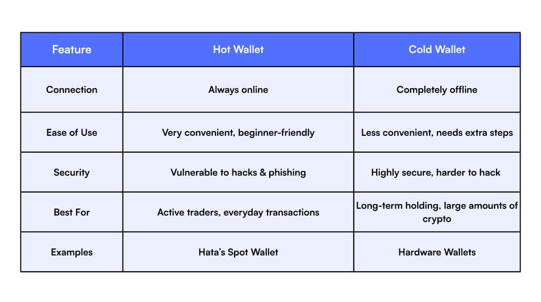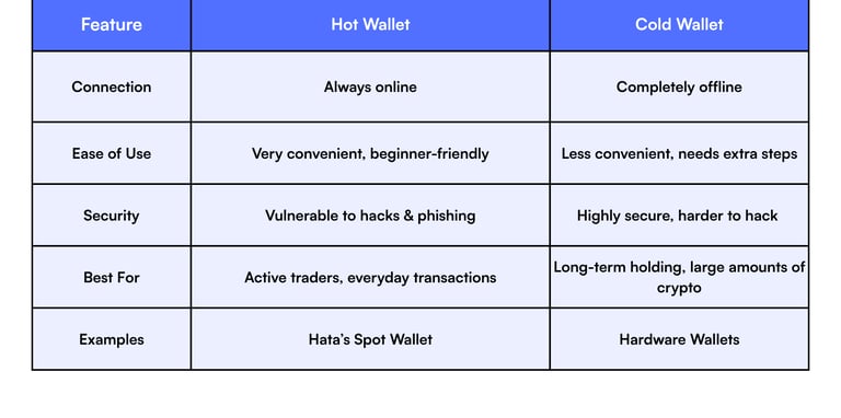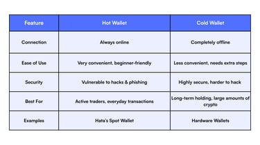 Hot Wallets: Connected to the internet → convenient for trading but more exposed to hacks.